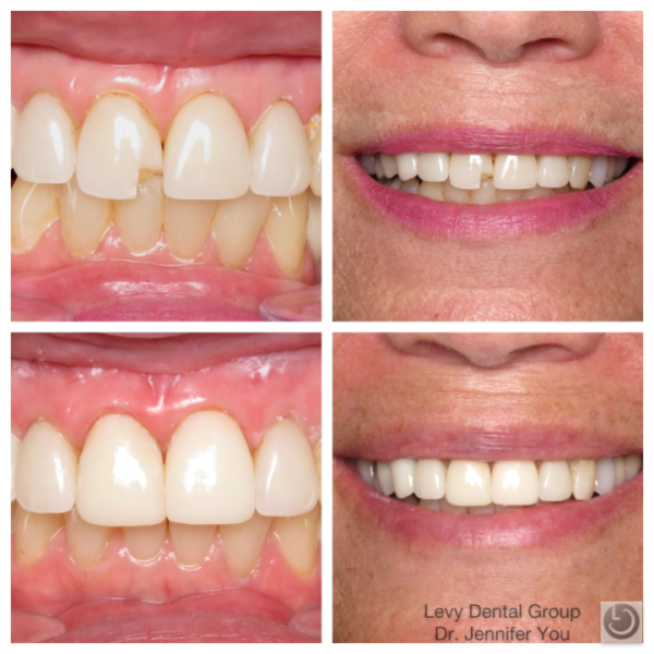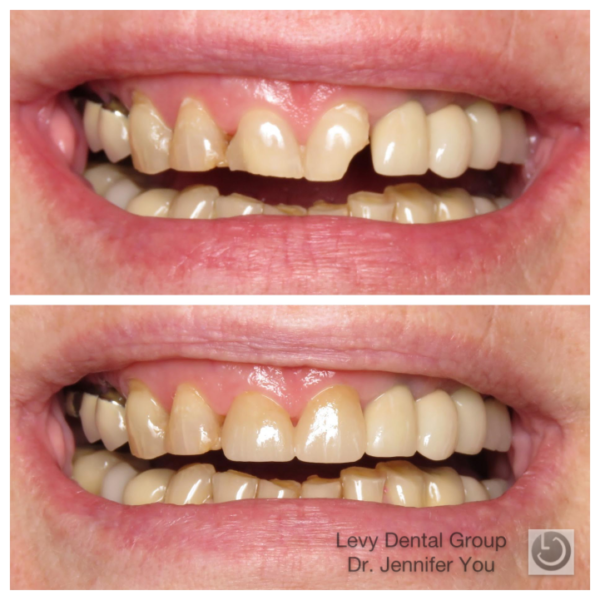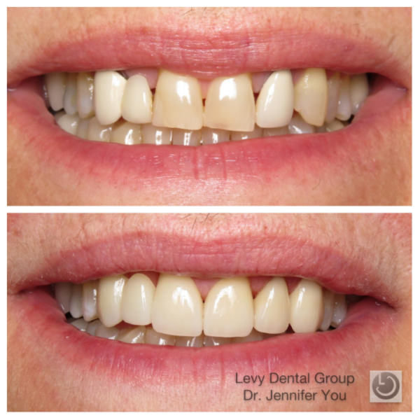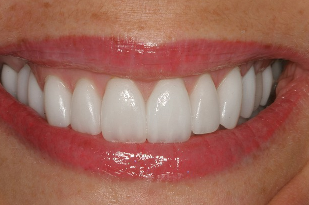 Six ceramic crowns and veneers were installed to improve the patients smile, giving her a beautiful and natural smile.