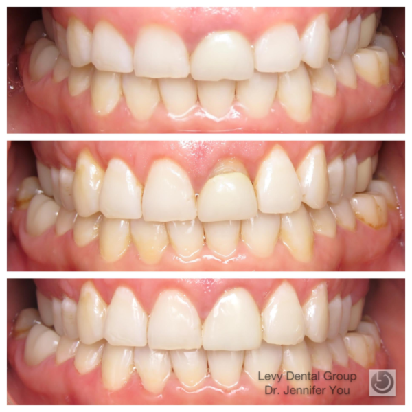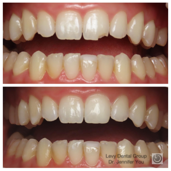 The repair of a fractured front tooth due to trauma. A composite restoration (tooth-colored, bonded filling) was used to repair this tooth in less than 1 hour.